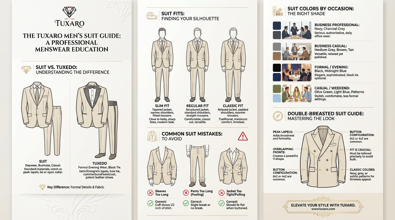 This guide will help you understand the difference between a suit and a tuxedo, how to choose the right fit, the most common mistakes to avoid, which colors work best for each occasion, and when a double-breasted suit is the right choice.